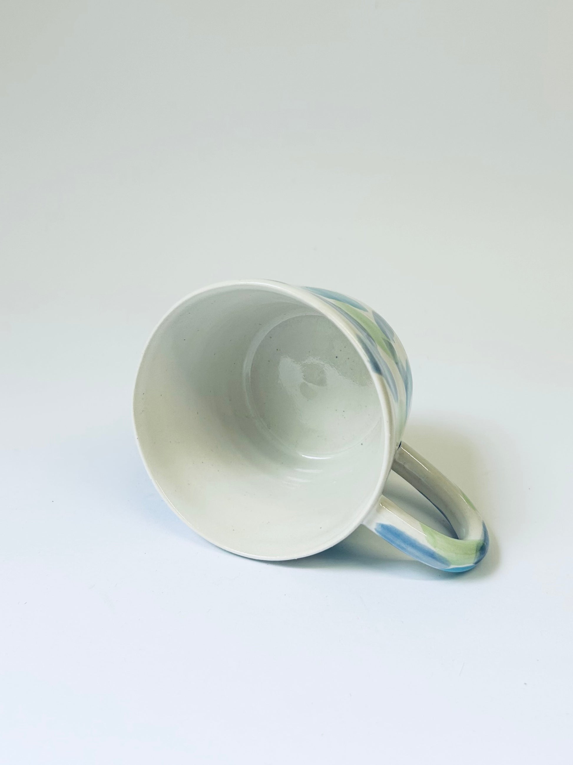 A mug thrown from off white stoneware clay, hand painted and finished with glazes.
