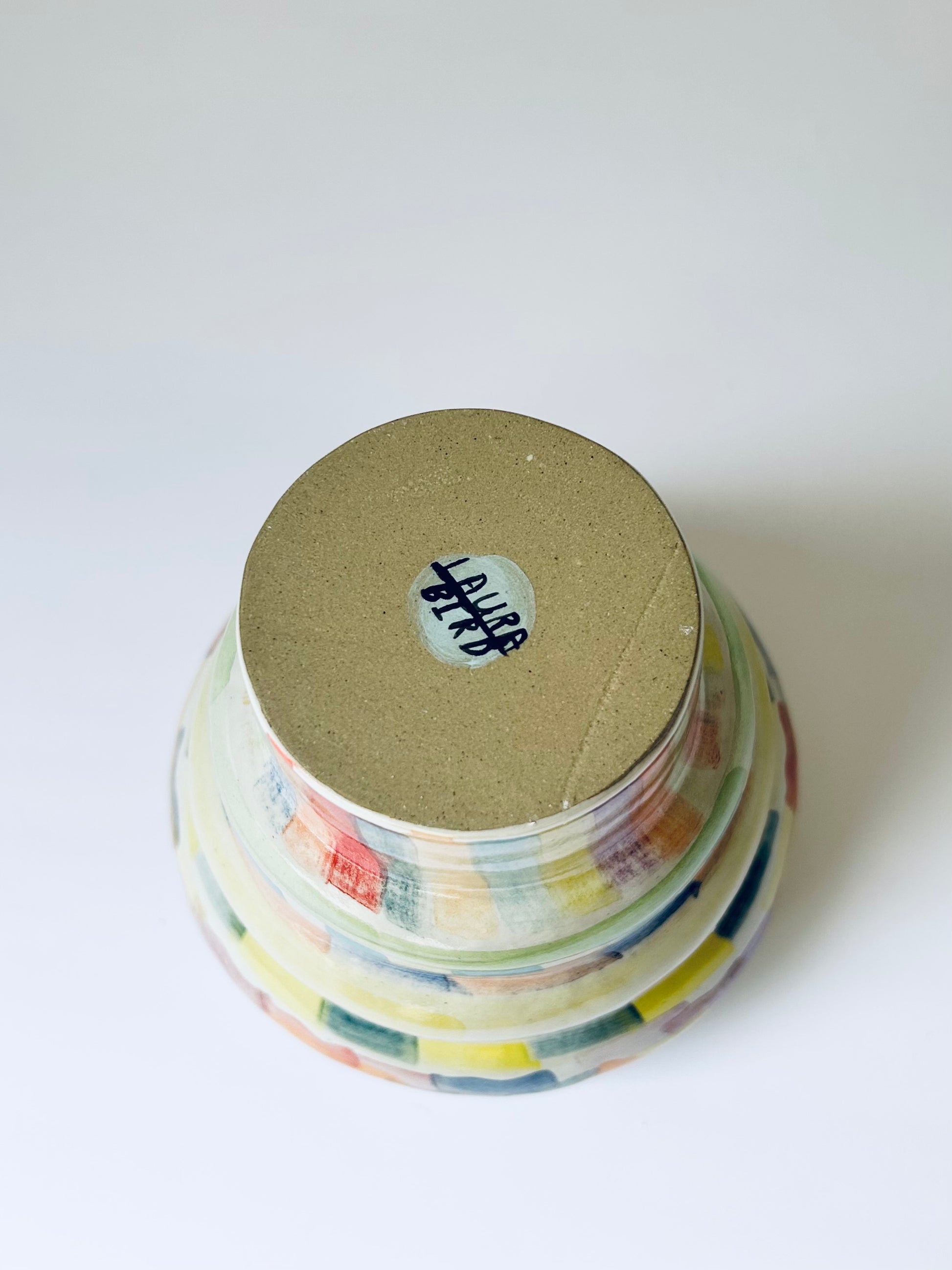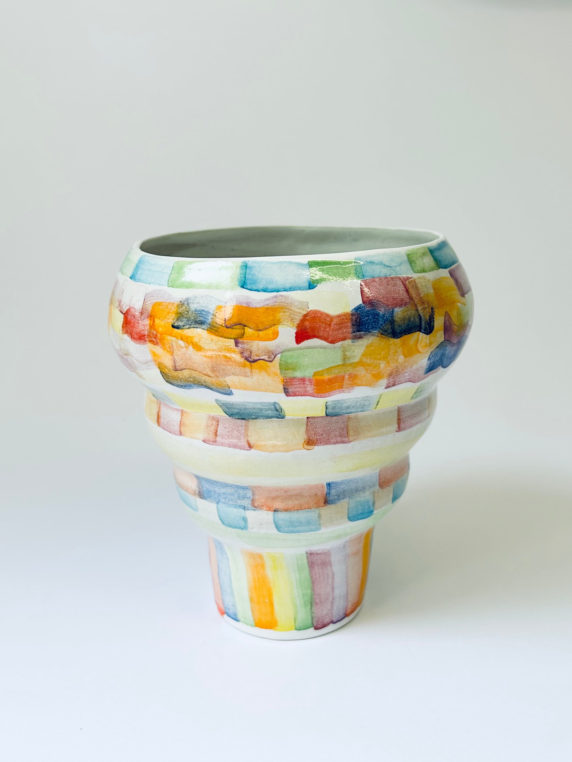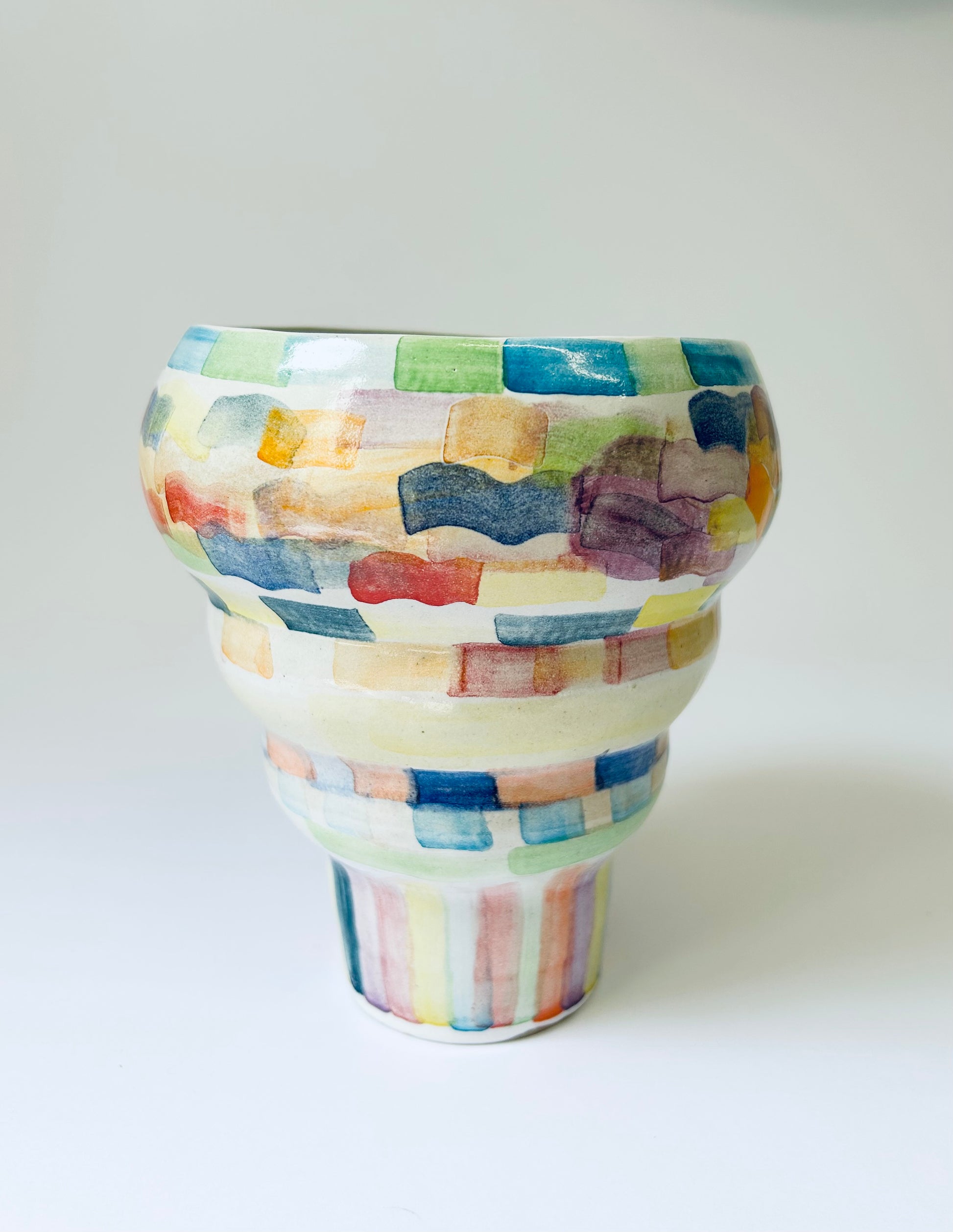 A colourful vase hand formed from buff stoneware clay, glazed with a shiny white glaze and painted with ceramic stains.