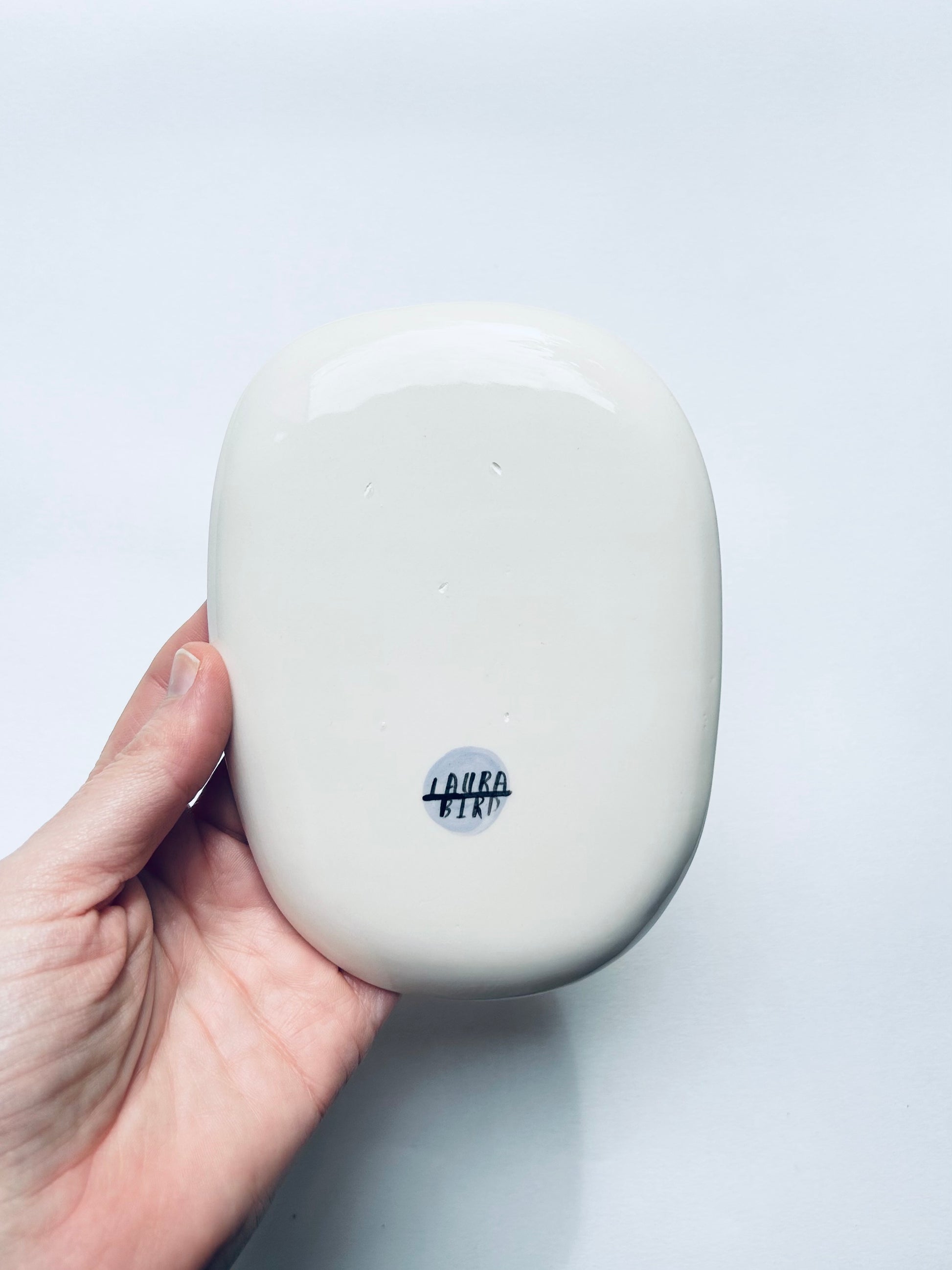 A decorative plate formed from white earthenware clay, hand painted and finished with a clear shiny glaze.