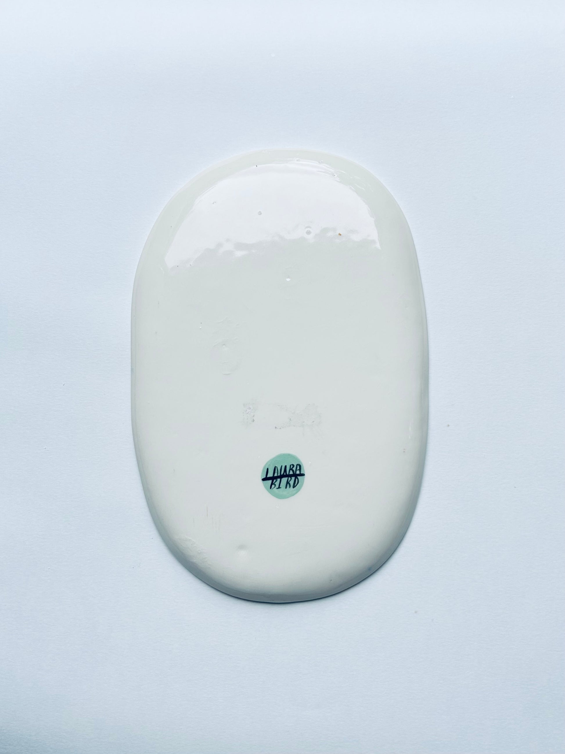 A decorative plate formed from white earthenware clay, hand painted and finished with a clear shiny glaze.