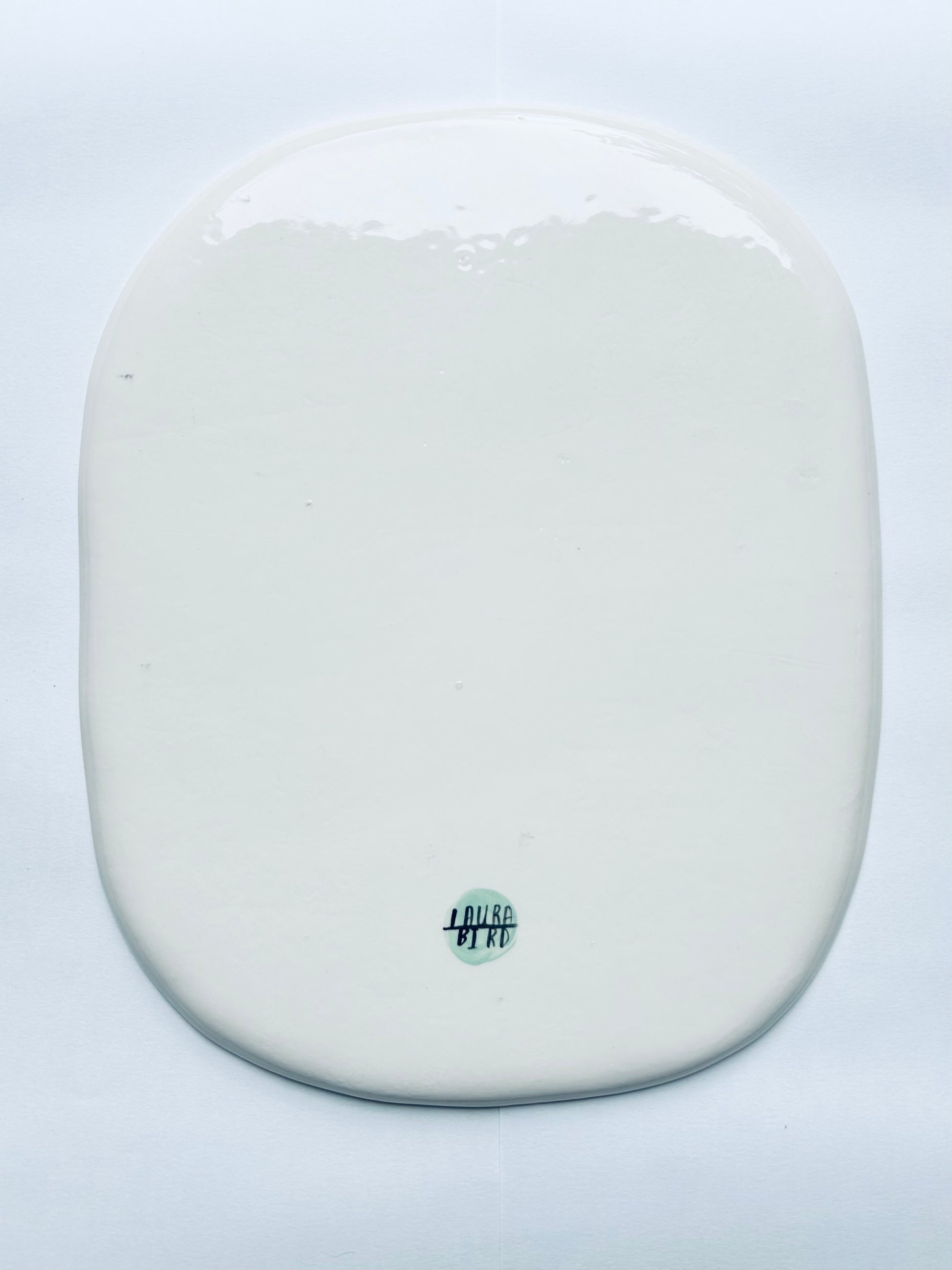 A large decorative plate formed from white earthenware clay, hand painted and finished with a clear shiny glaze.