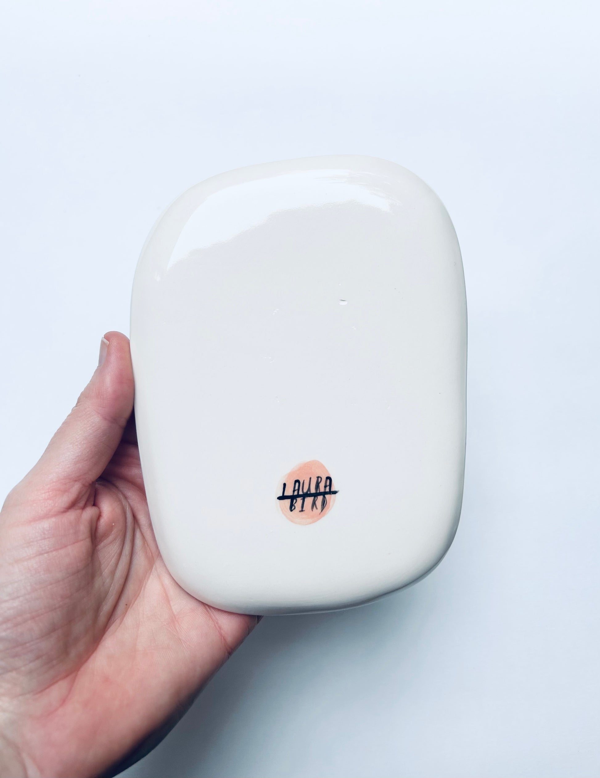 A decorative plate formed from white earthenware clay, hand painted and finished with a clear shiny glaze.