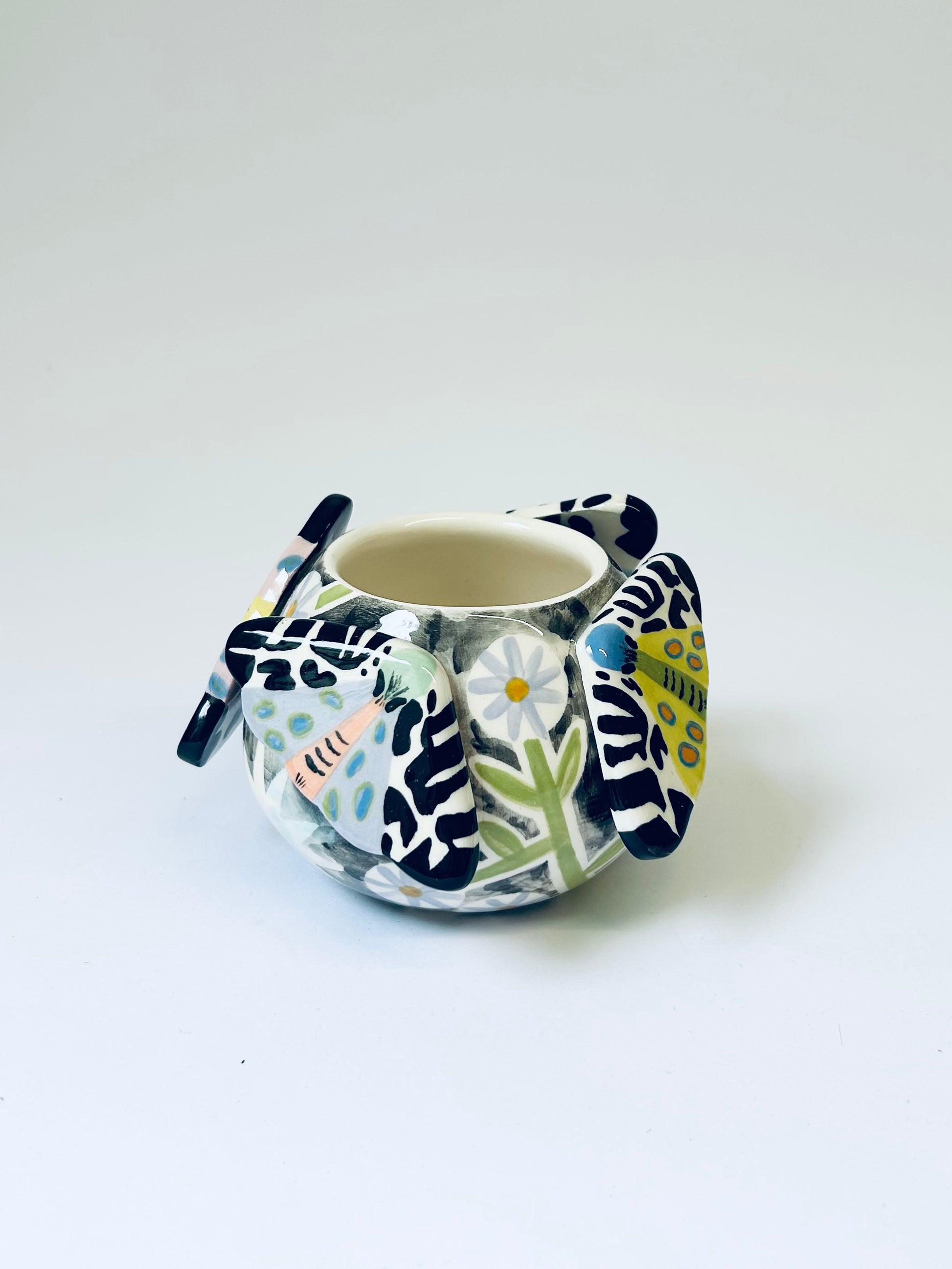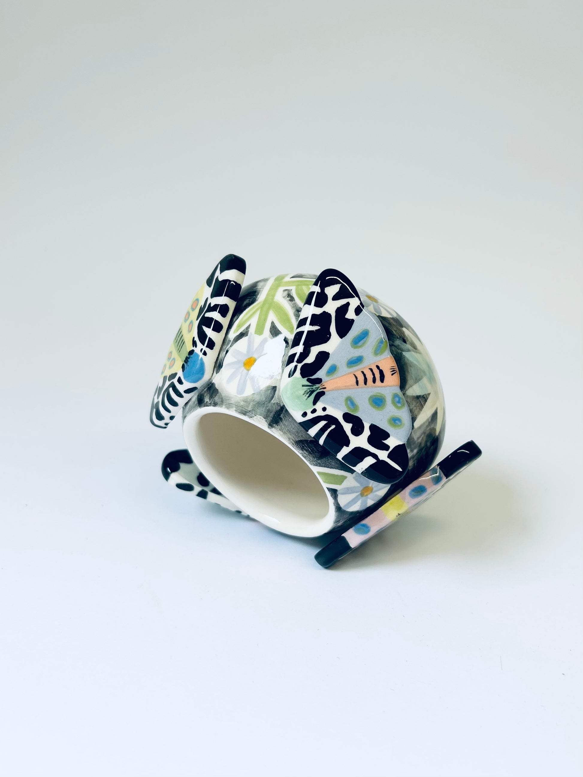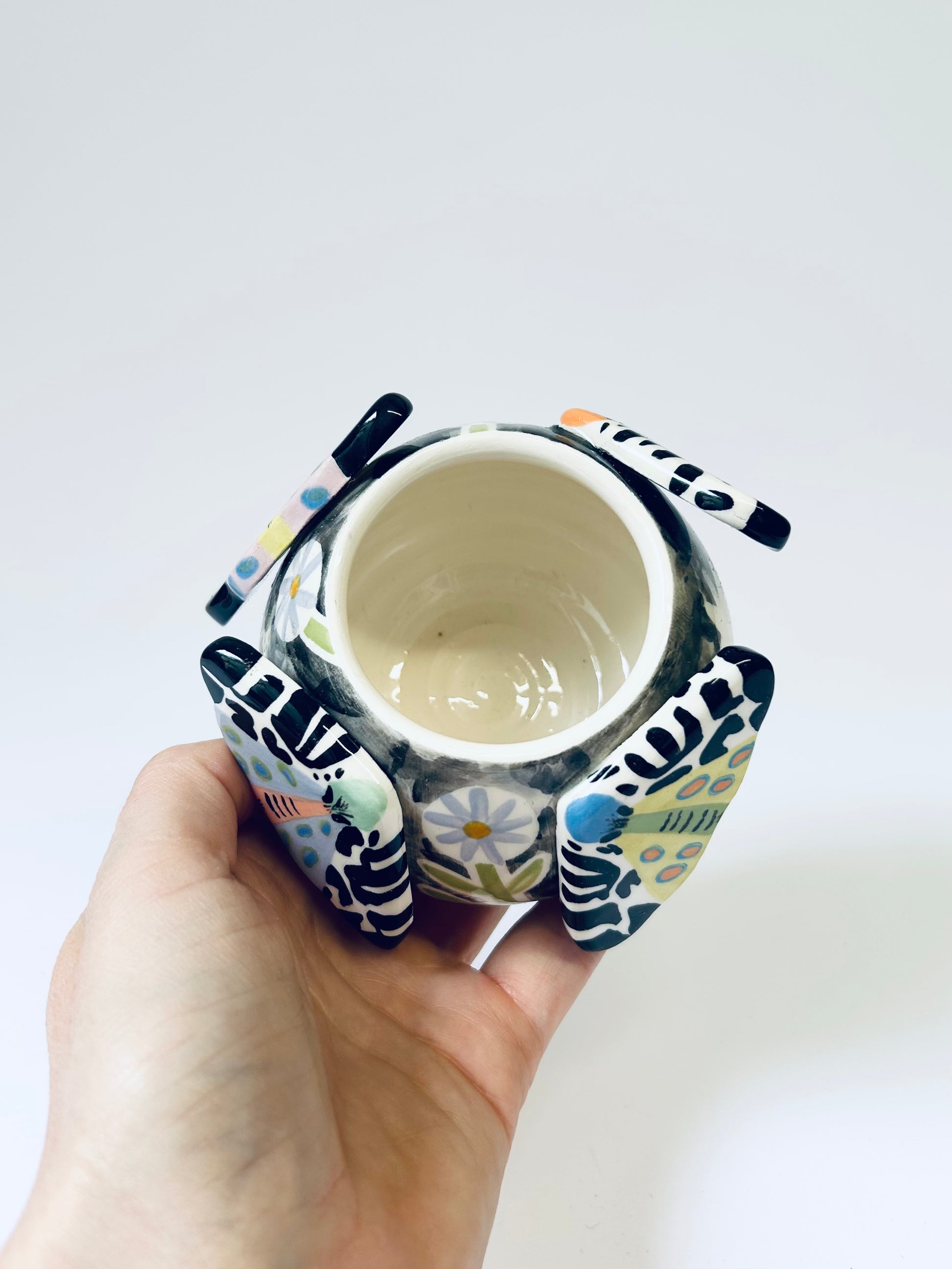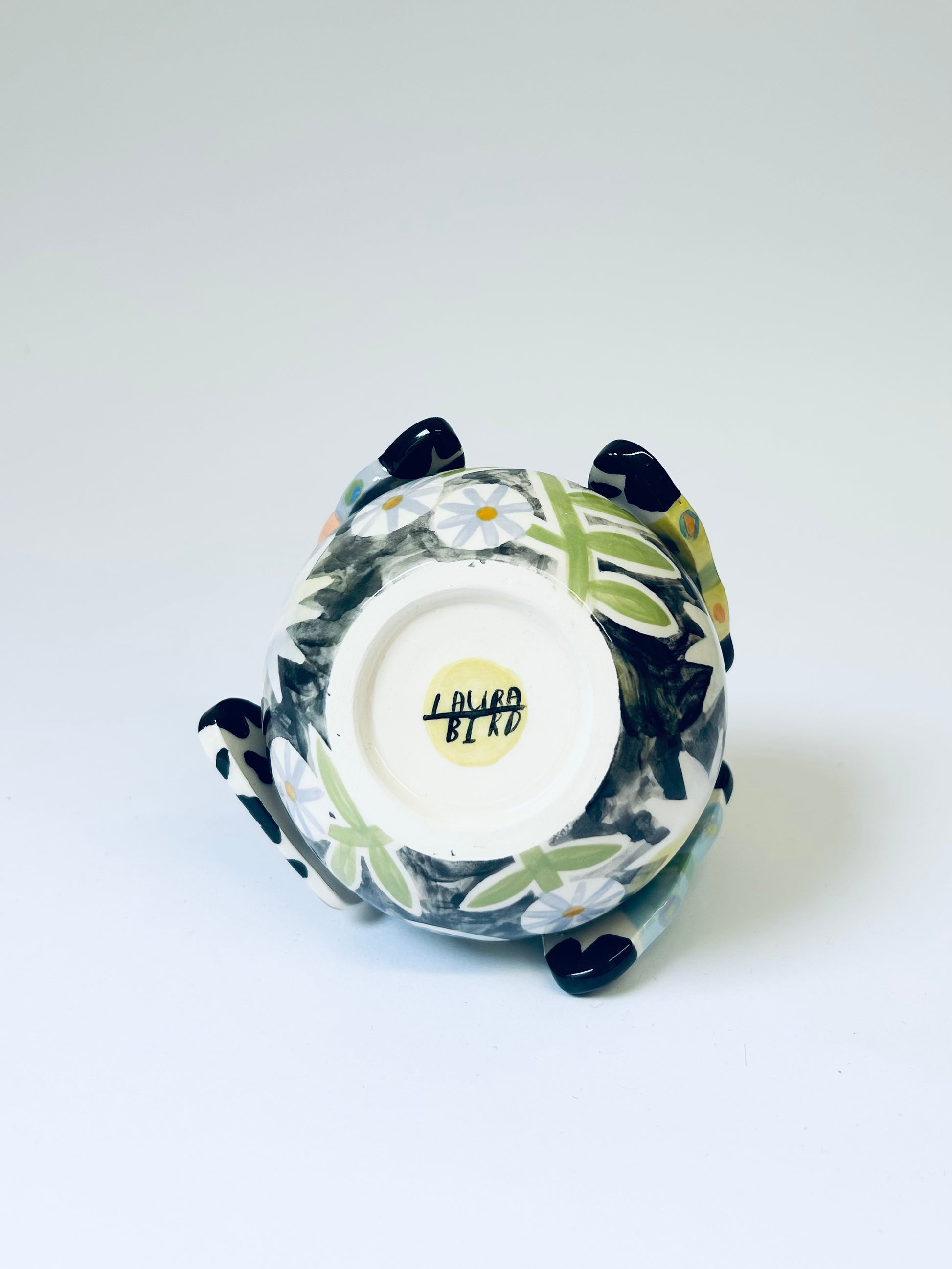 A unique pot formed from white earthenware clay, hand painted and finished with a clear shiny glaze.