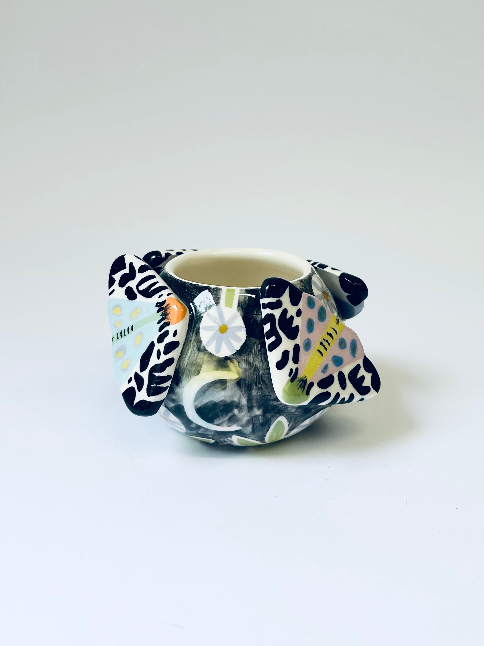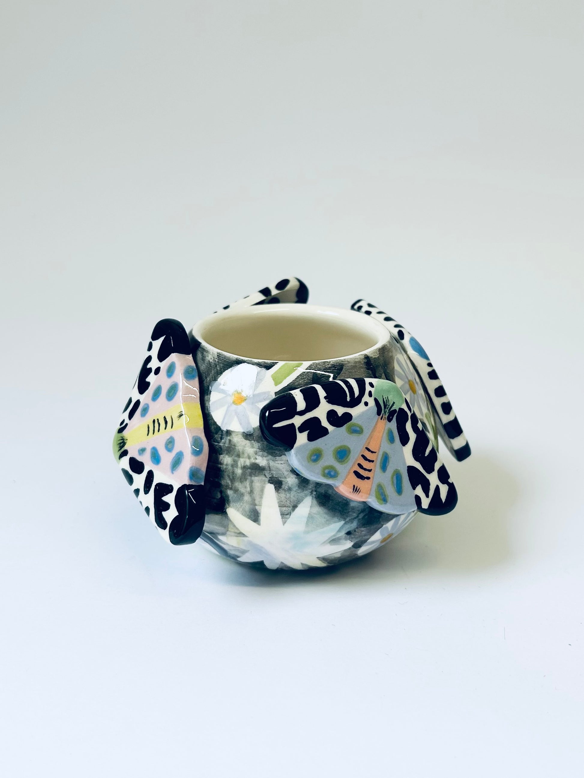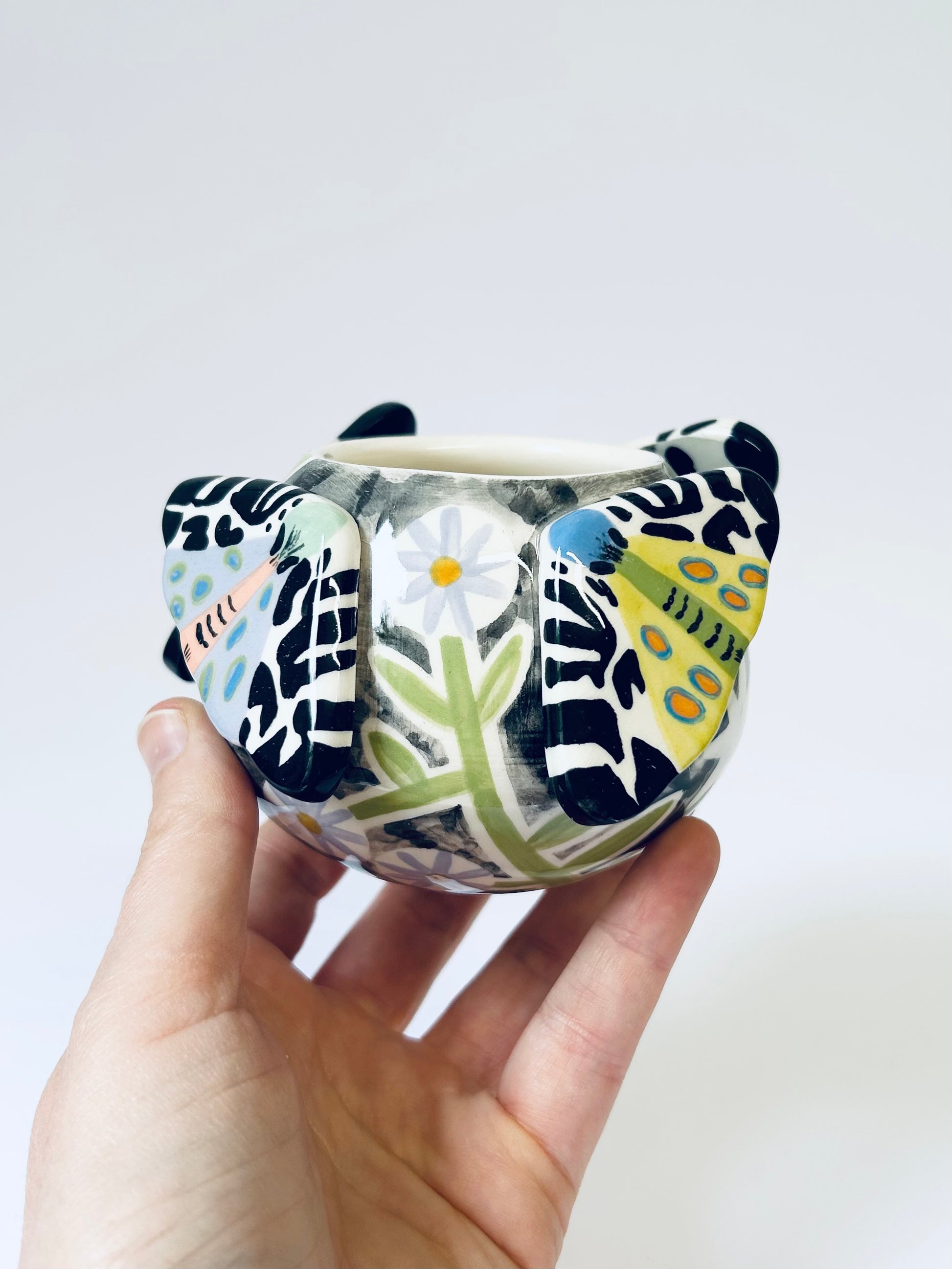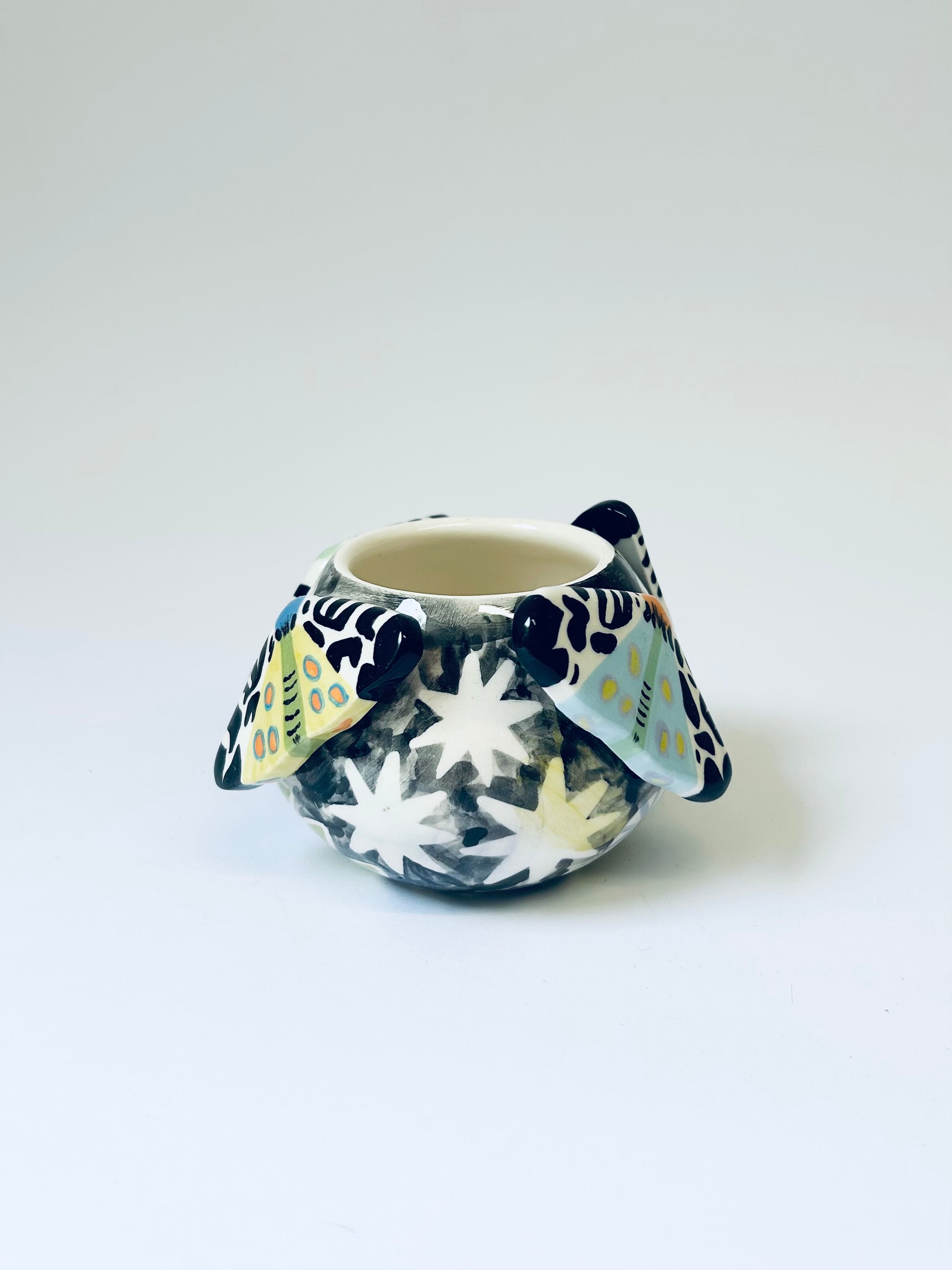 A unique pot formed from white earthenware clay, hand painted and finished with a clear shiny glaze.