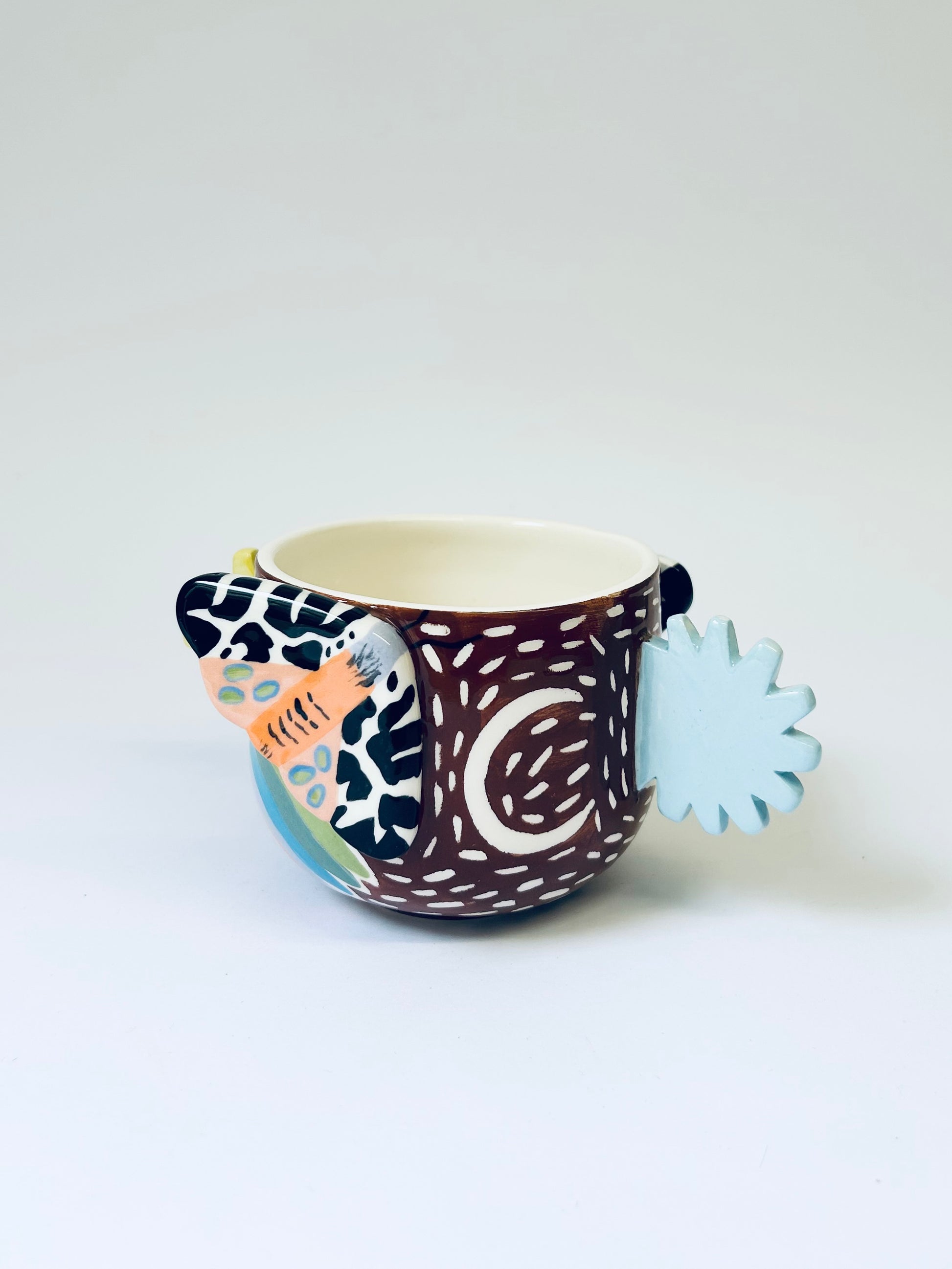 A unique vessel formed from white earthenware clay, hand painted and finished with a clear shiny glaze.