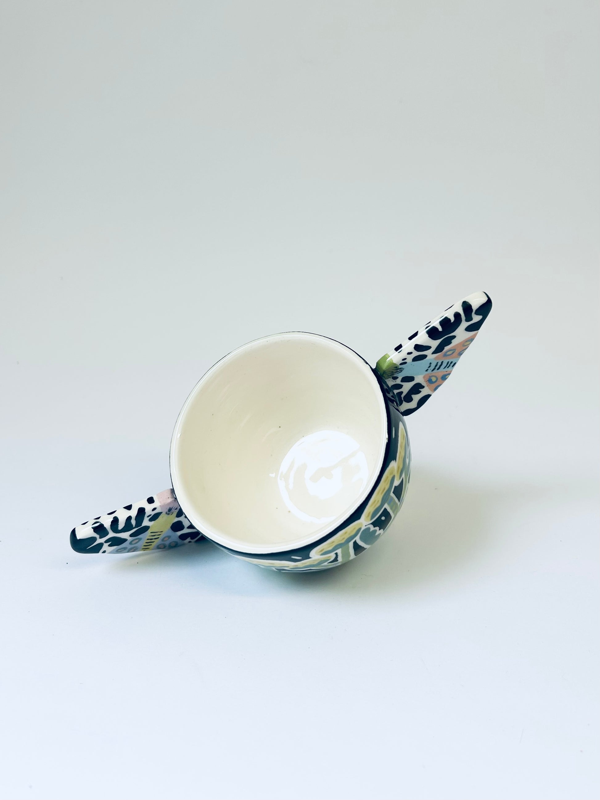 A unique vessel formed from white earthenware clay, hand painted and finished with a clear shiny glaze.