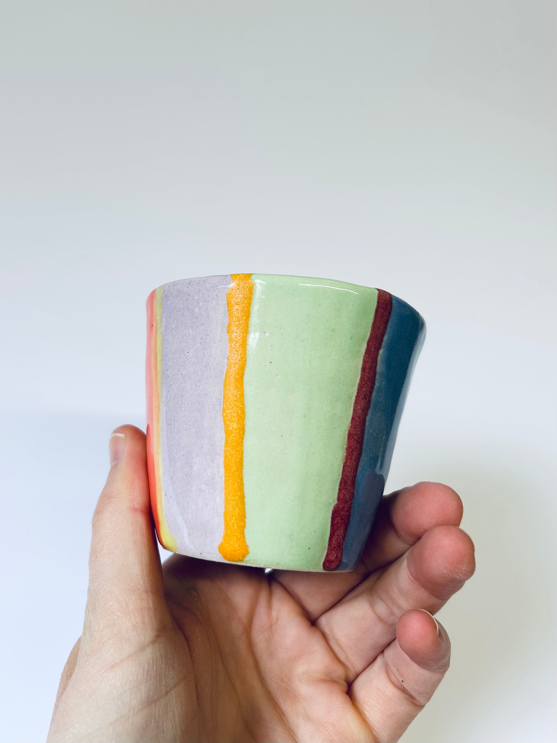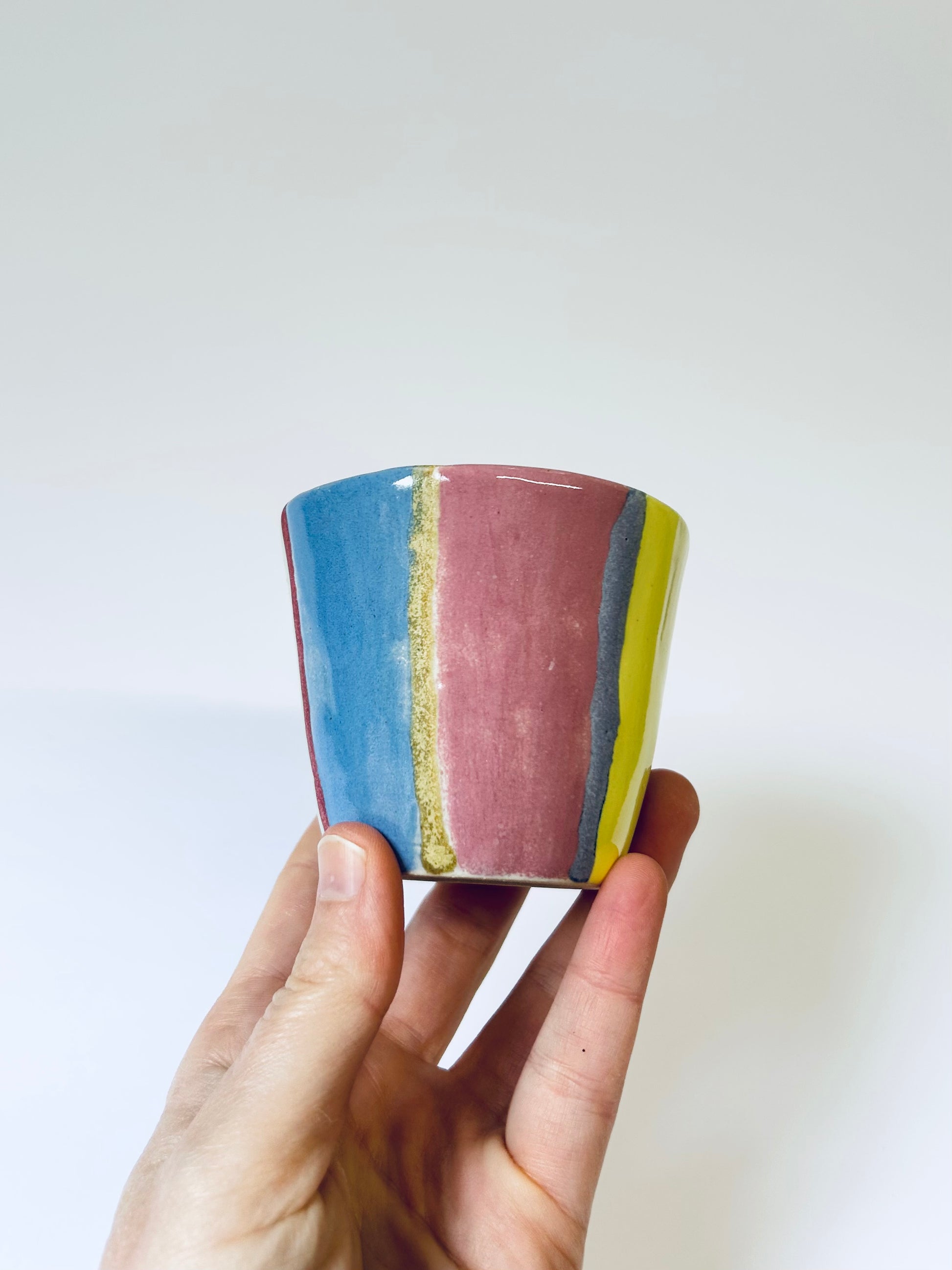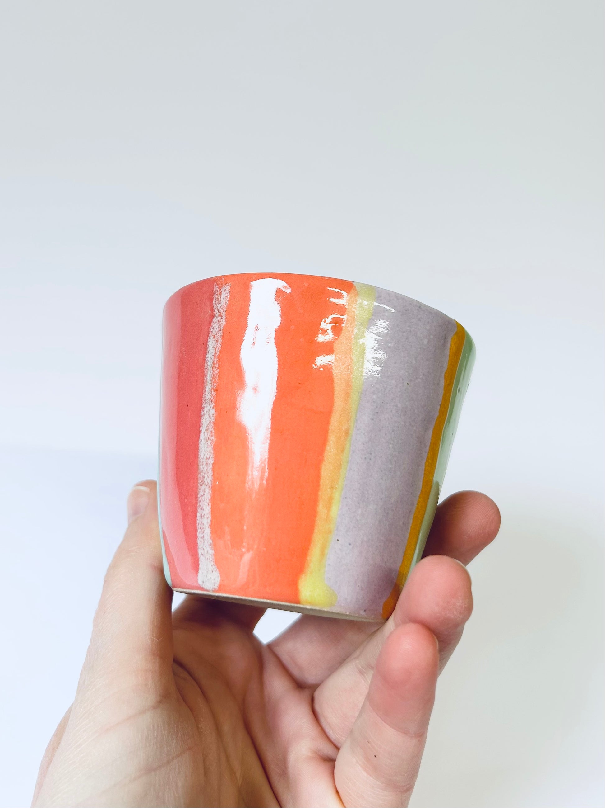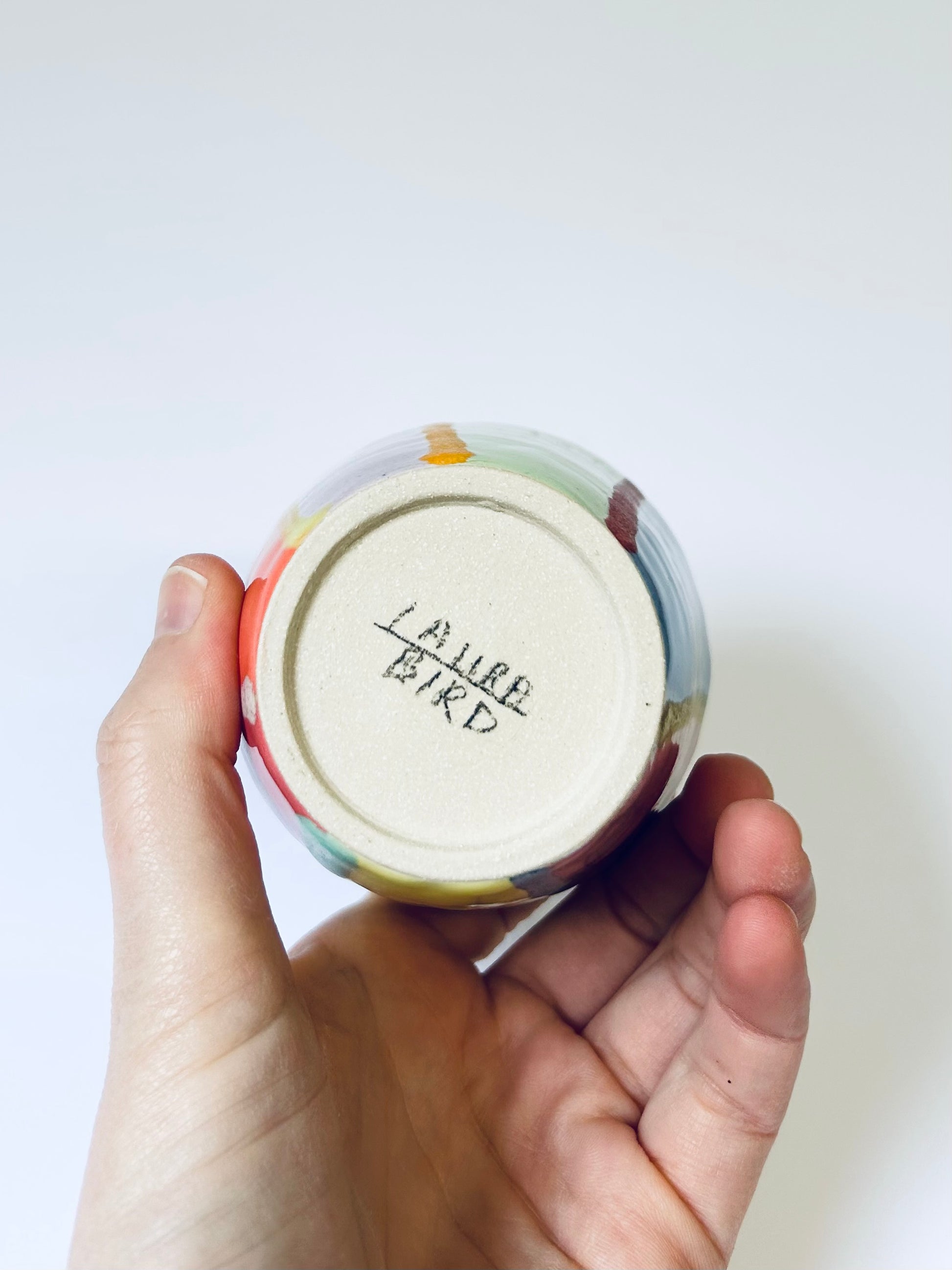 A cup thrown in off white stoneware clay, hand painted with glazes.