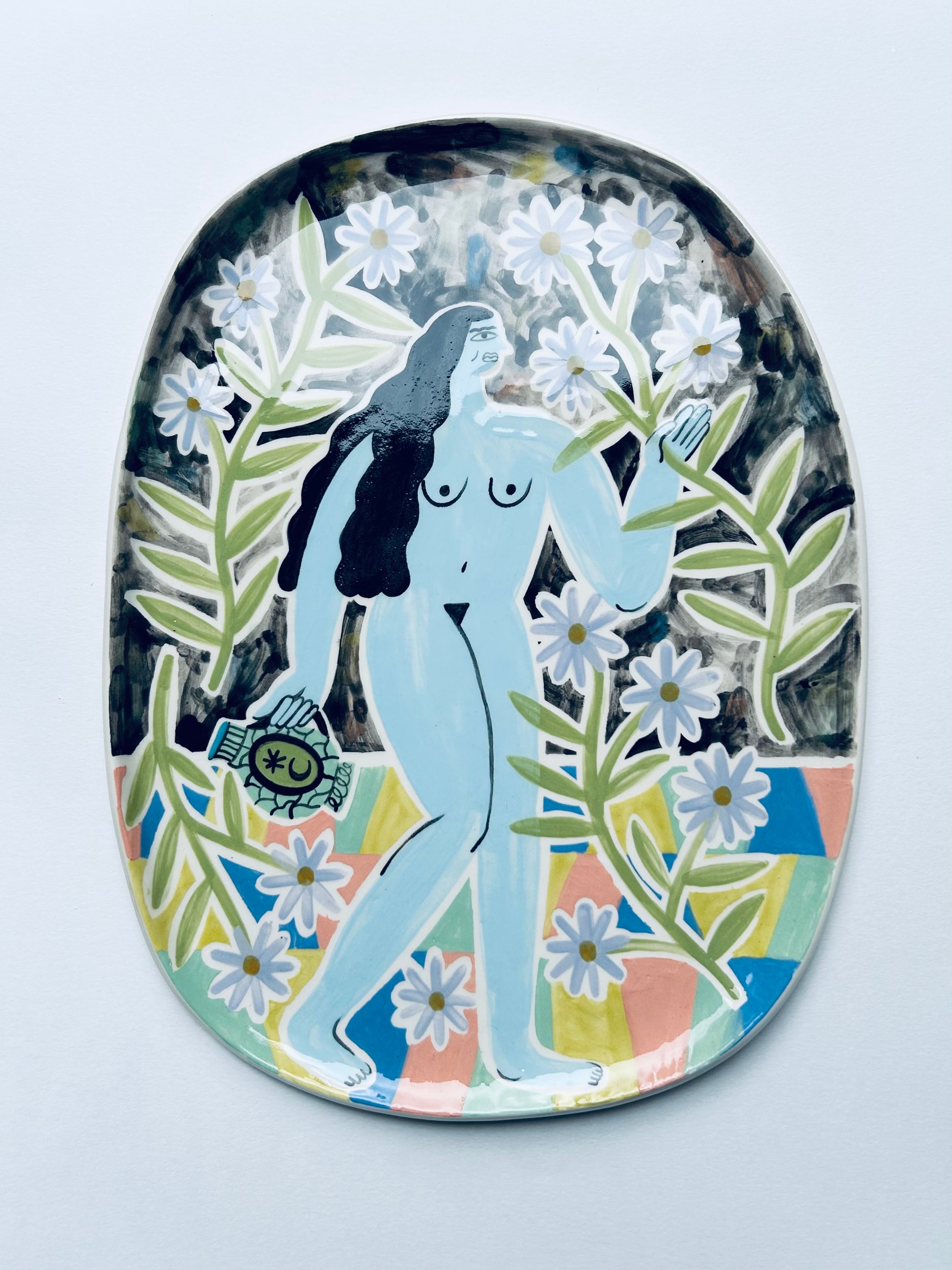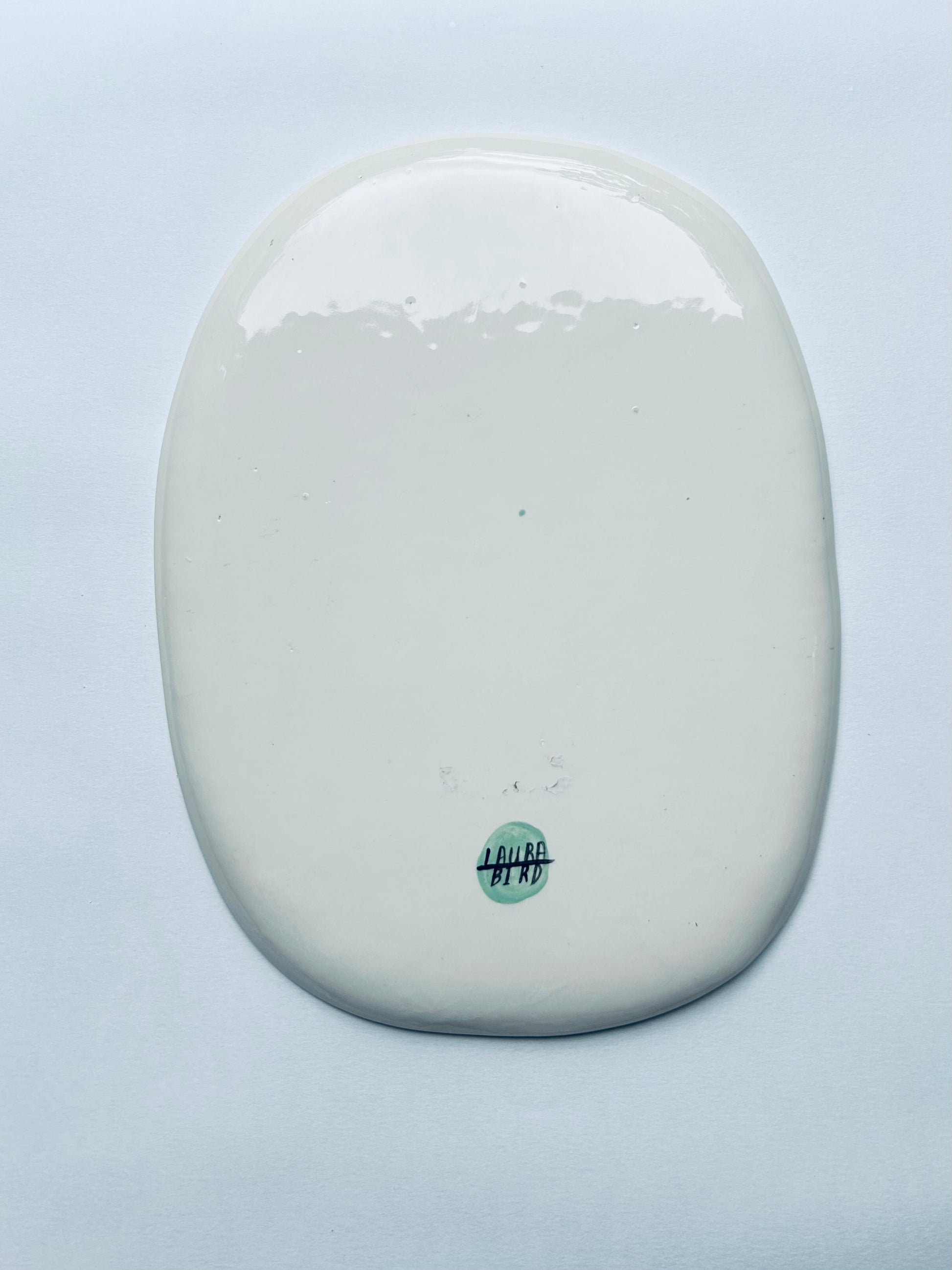 A decorative plate formed from white earthenware clay, hand painted and finished with a clear shiny glaze.