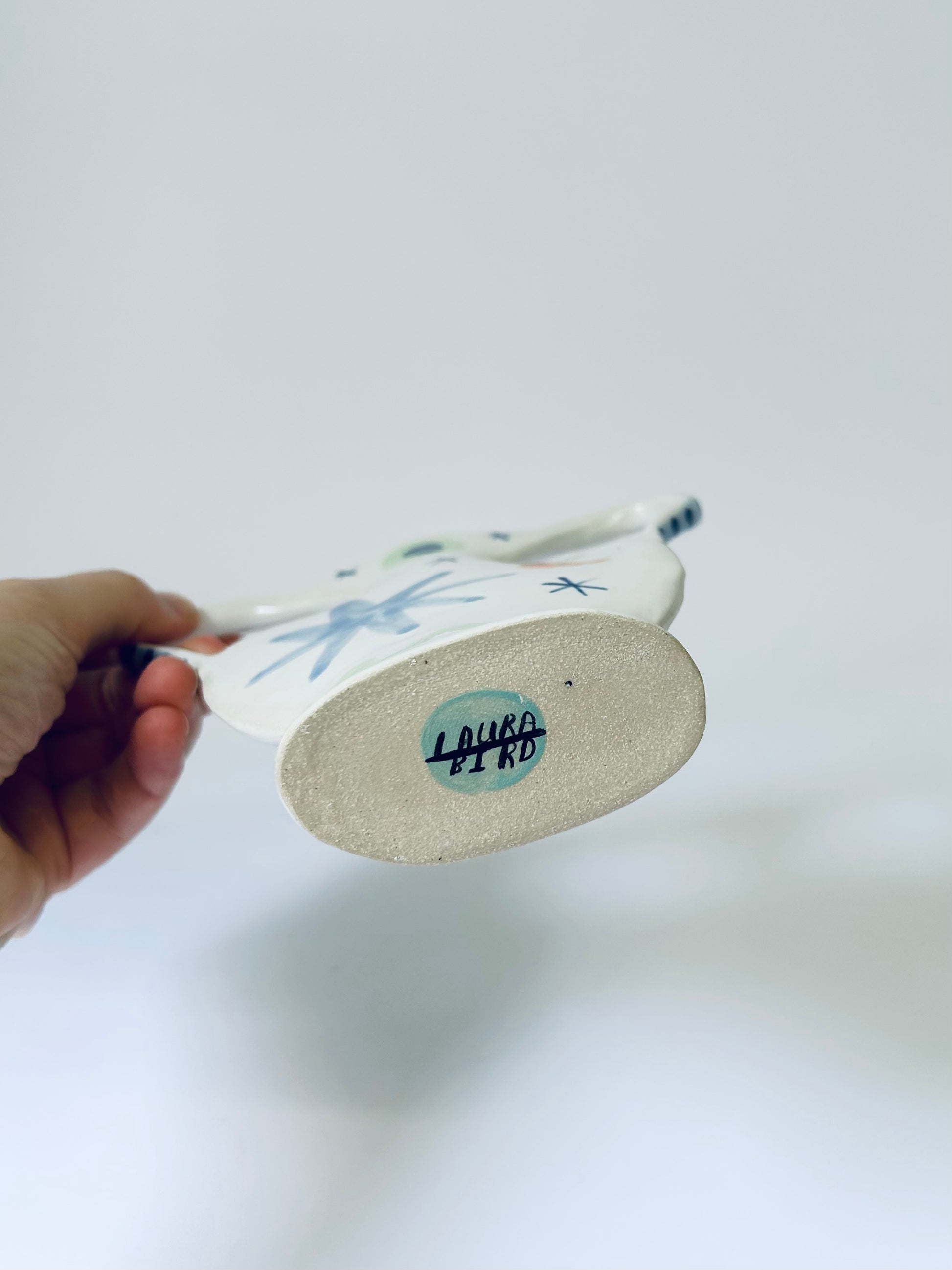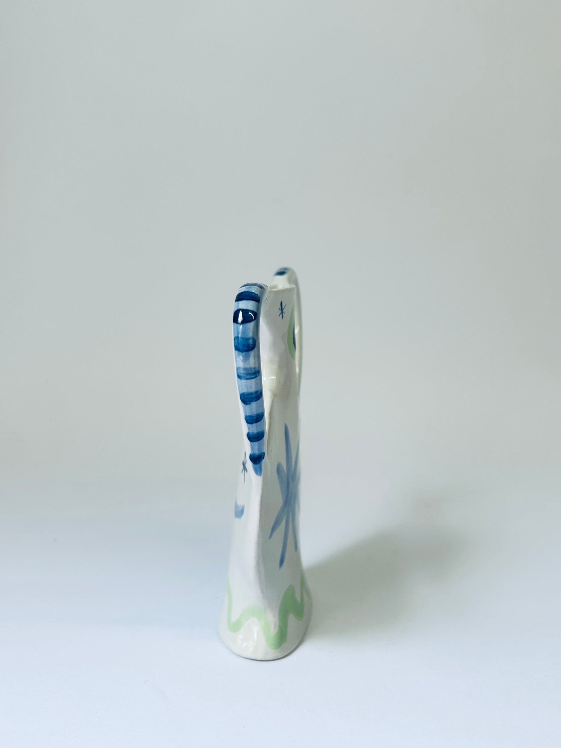 A beautiful vase hand formed from off while stoneware clay. It has been finished with a shiny white glaze and decorated by hand.