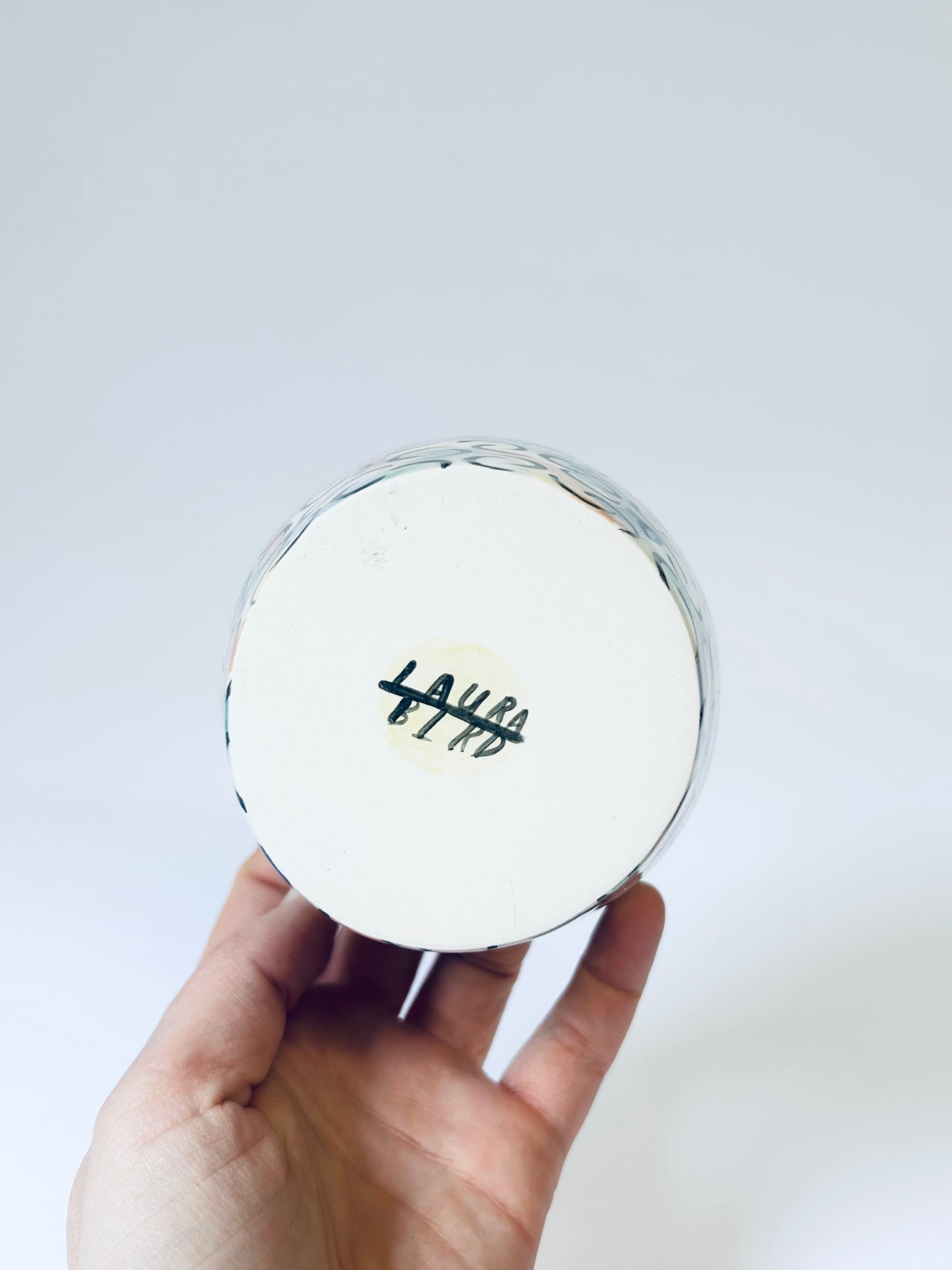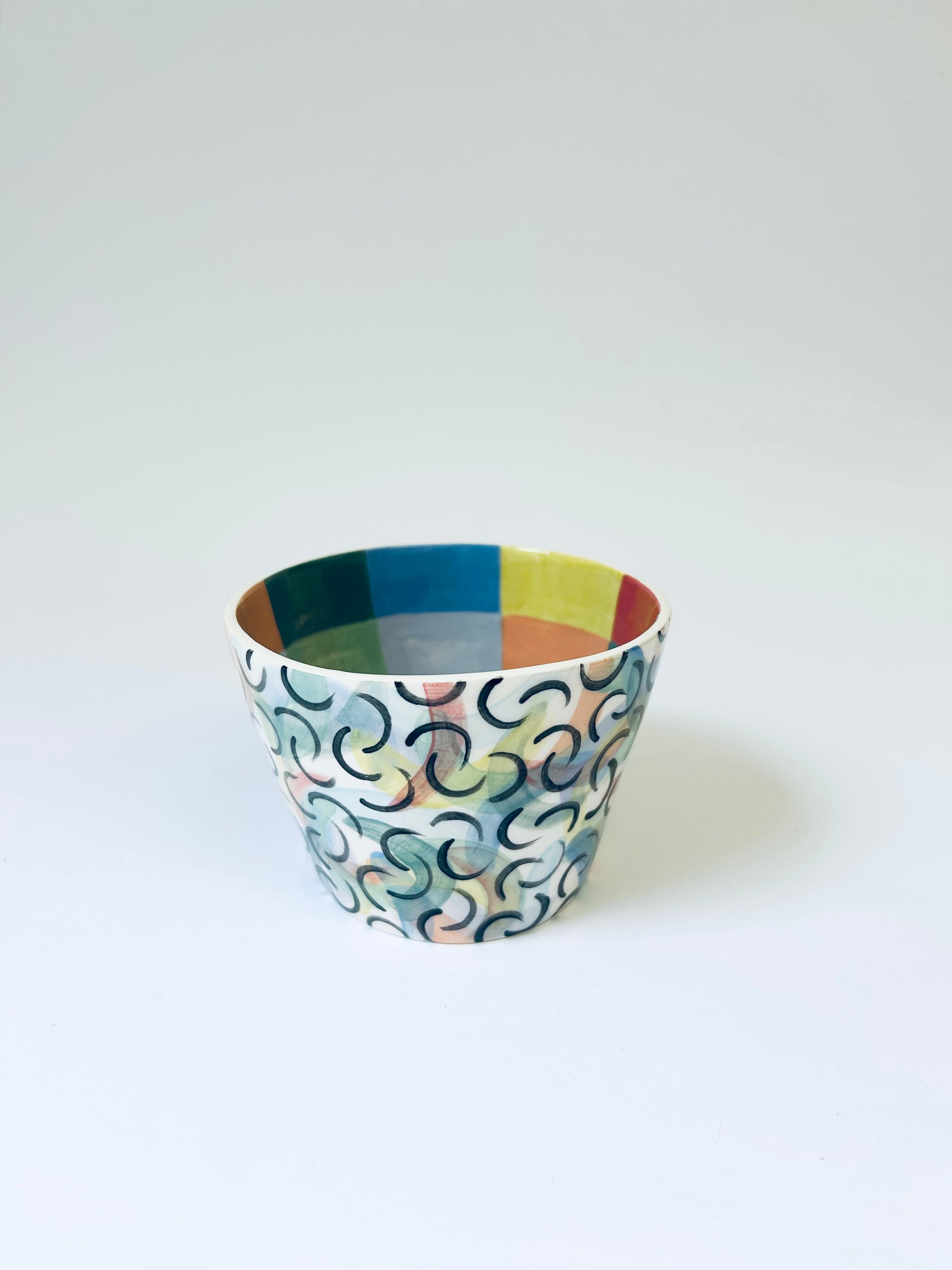 A fun cup formed from white earthenware clay, hand painted and finished with a clear shiny glaze.