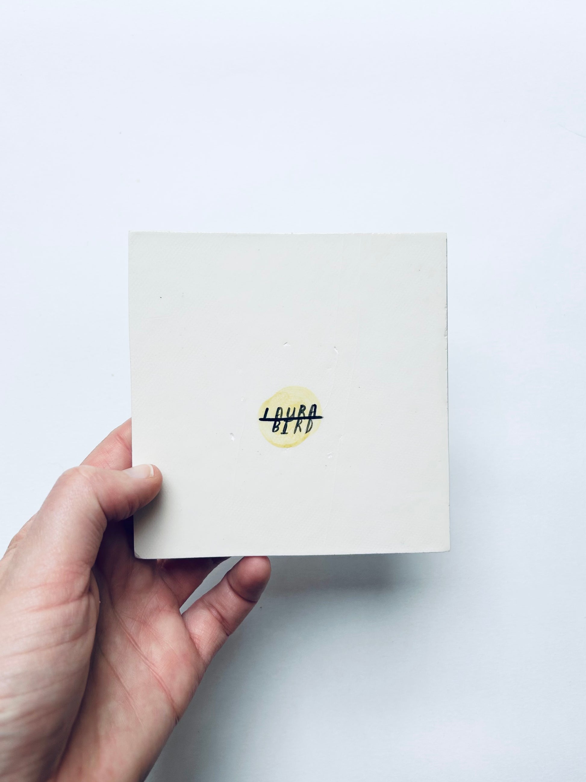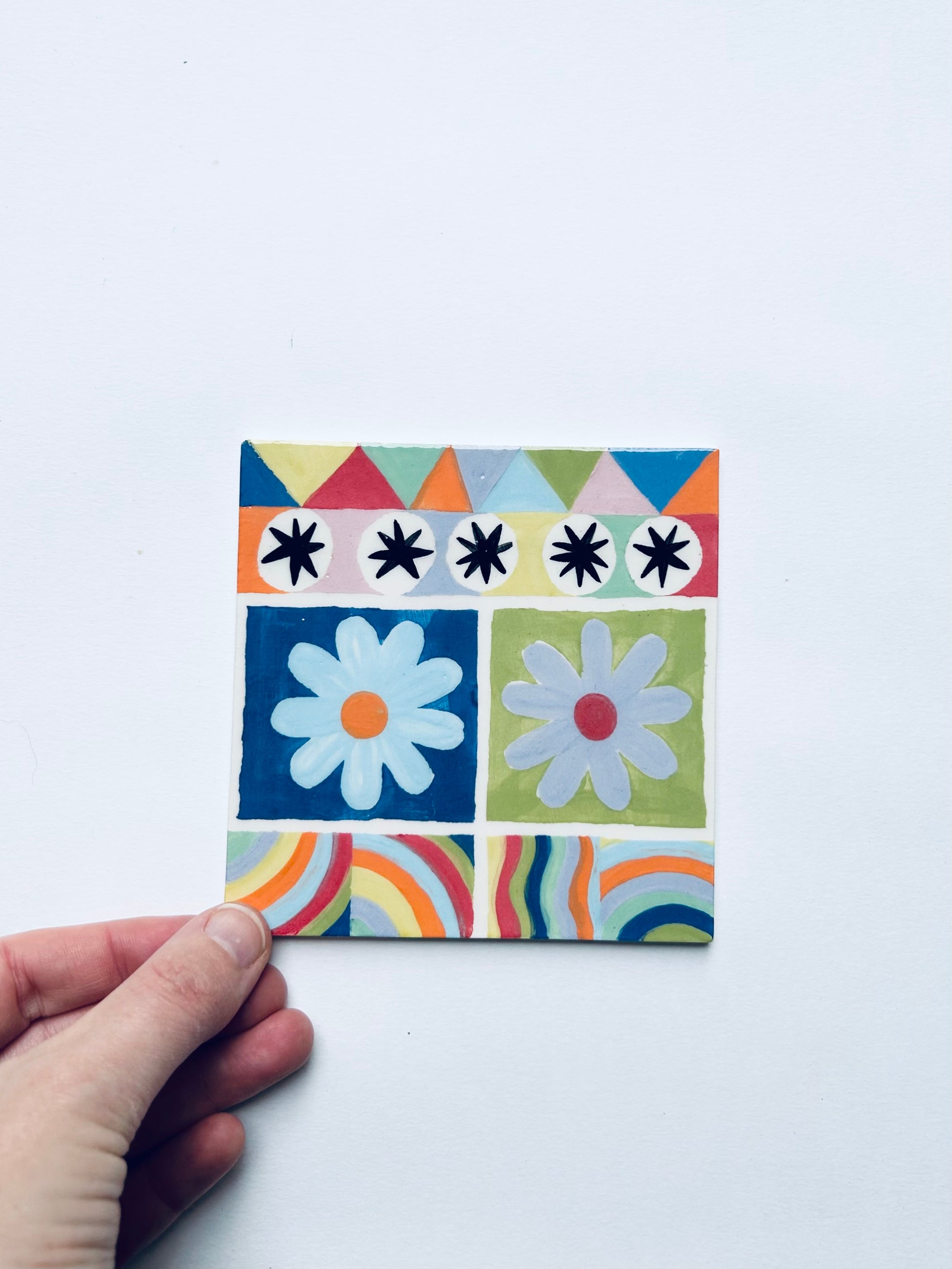 A fun tile formed from white earthenware clay, hand painted and finished with a clear shiny glaze.