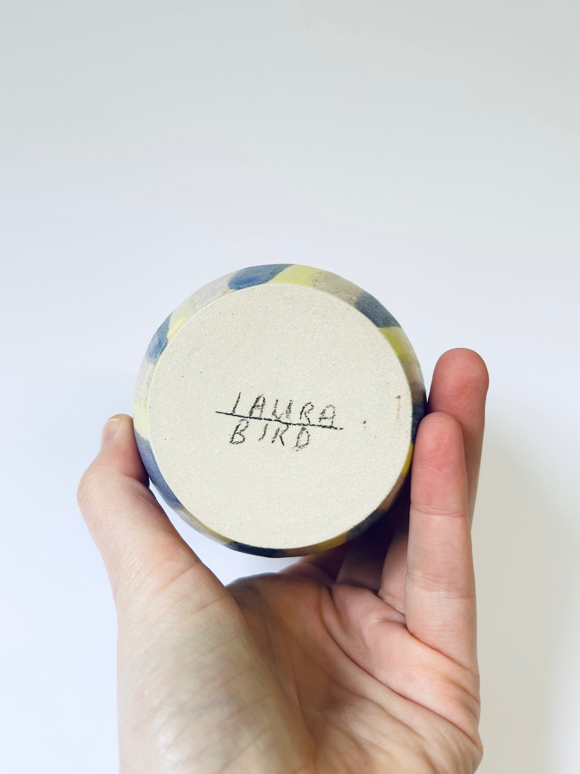 A cup thrown in off white stoneware clay, hand painted with glazes.