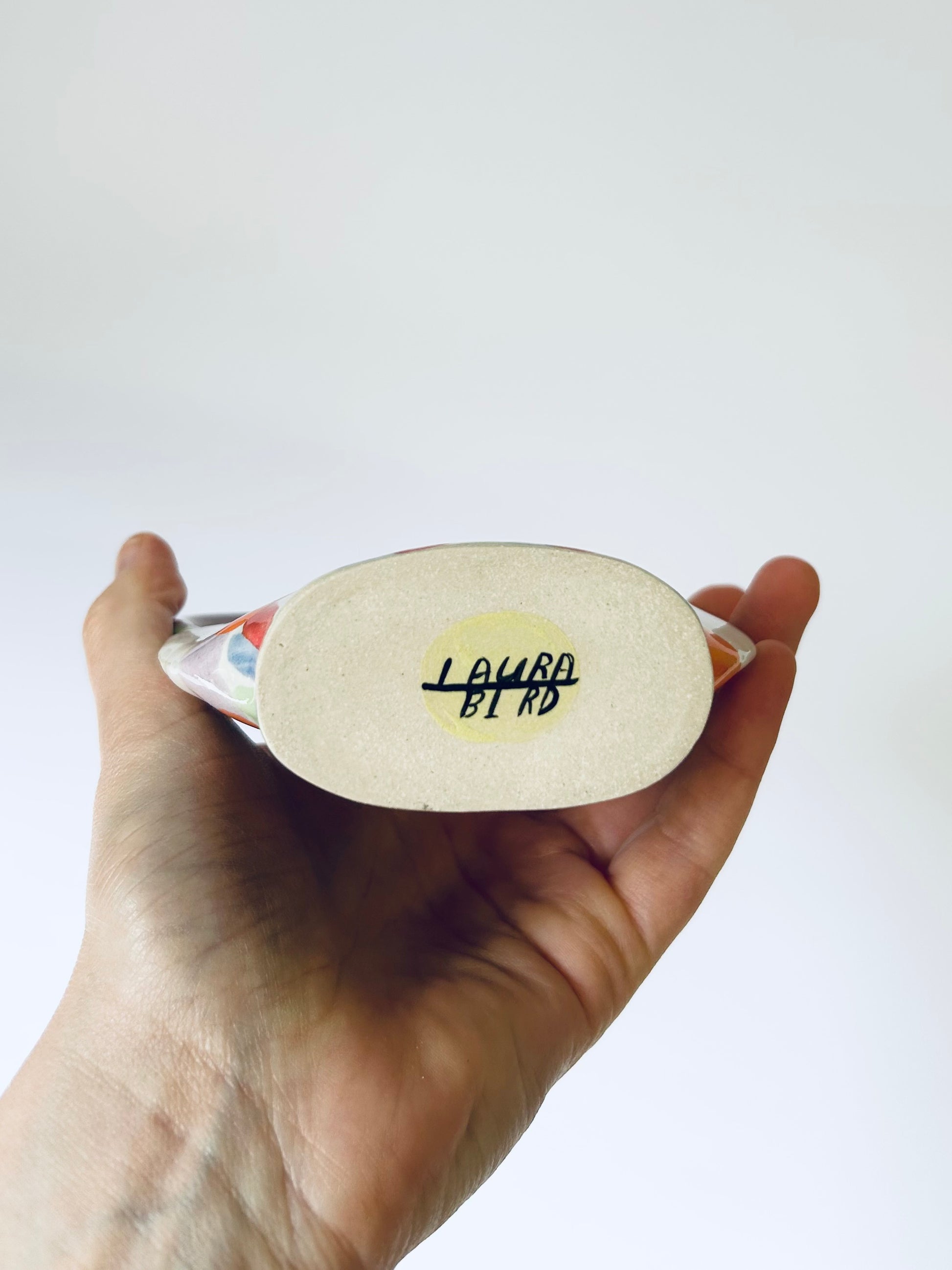 A beautiful vase hand formed from off while stoneware clay. It has been finished with a shiny white glaze and decorated by hand.