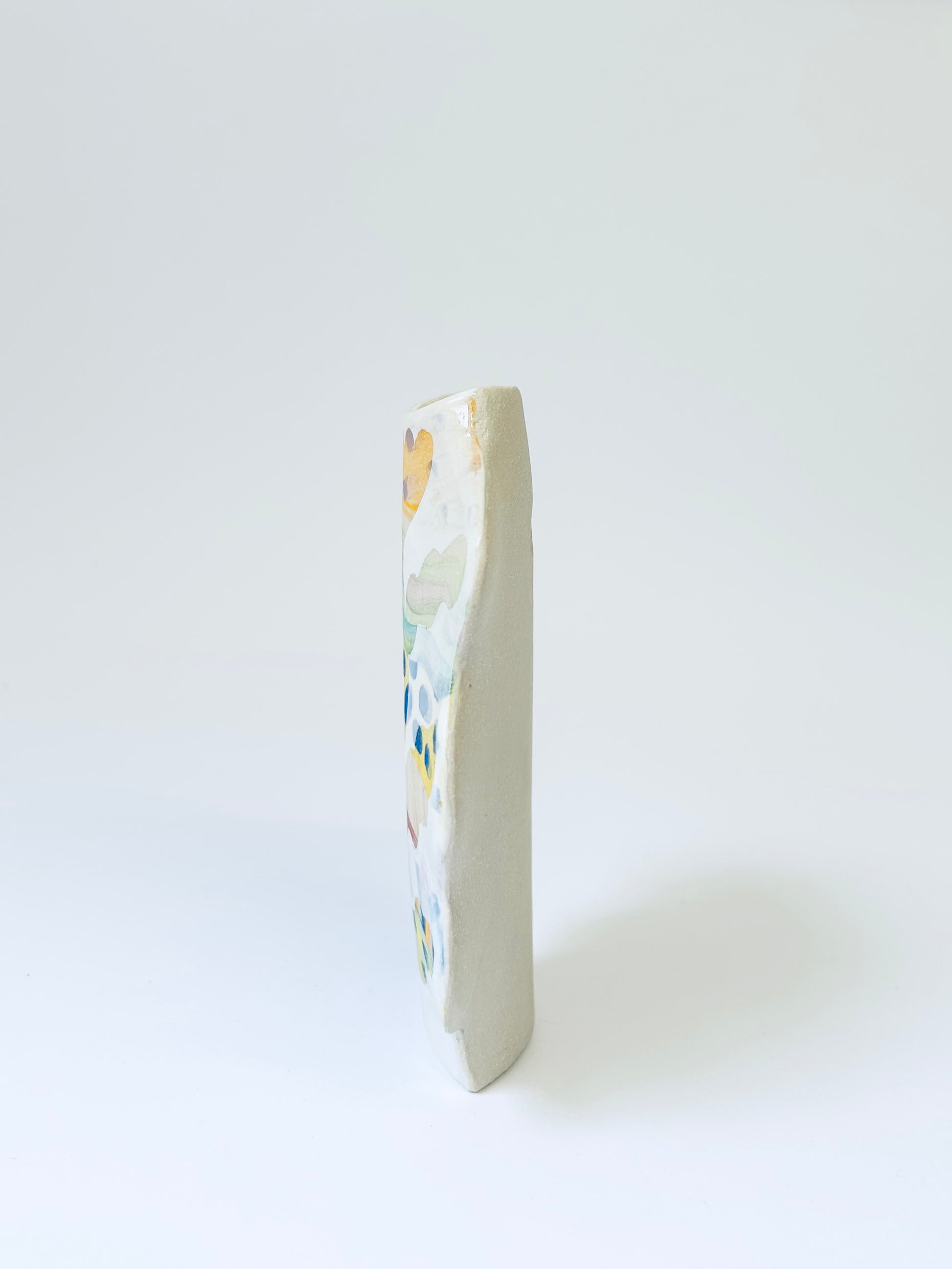 This interesting vase is formed from off white stoneware clay, specifically designed to display on a wall. It has been hand painted with stains, masked out and finished with a white shiny glaze. It is capable of holding water and features a hole on the back to hang on a hook/nail.