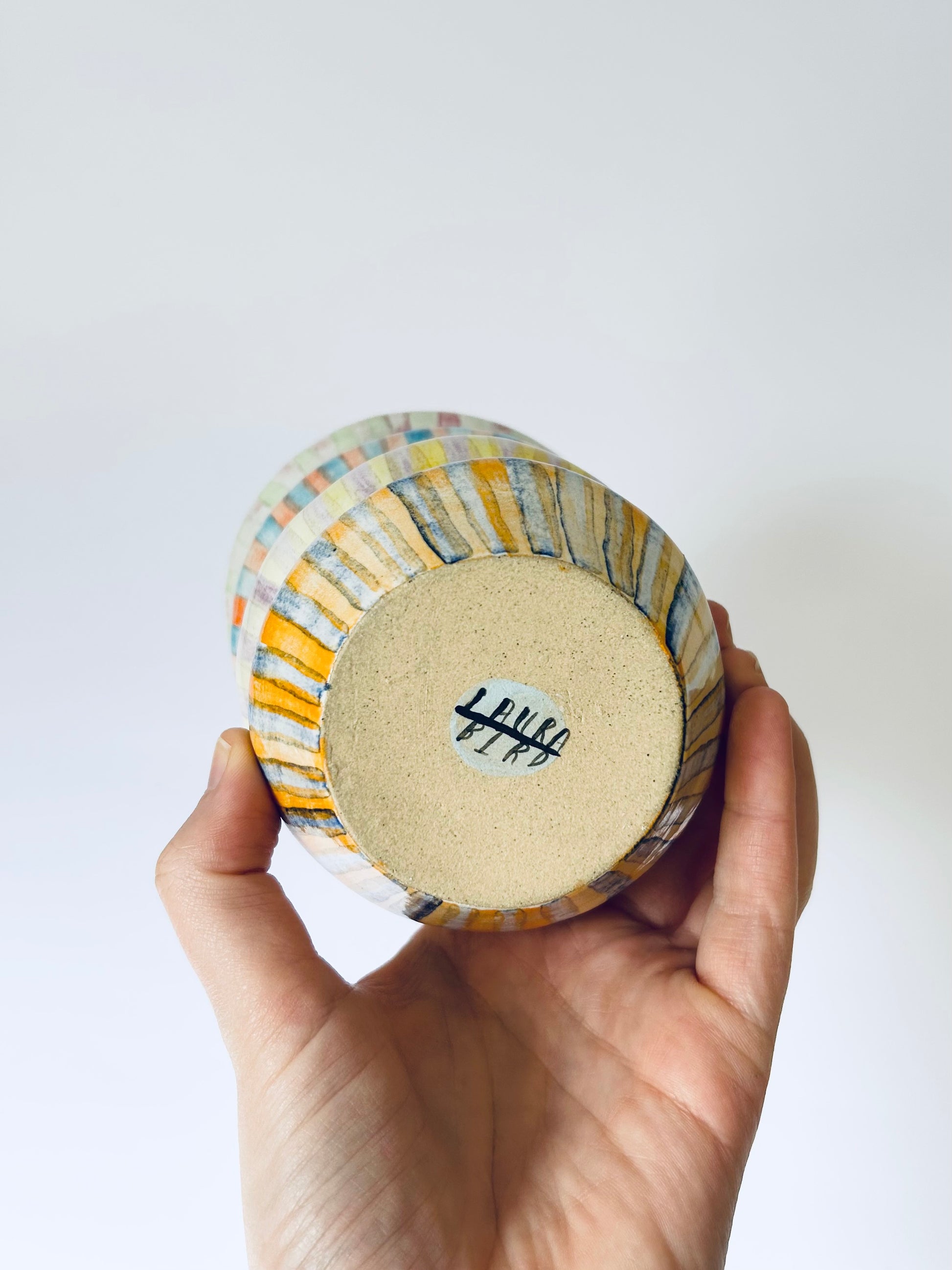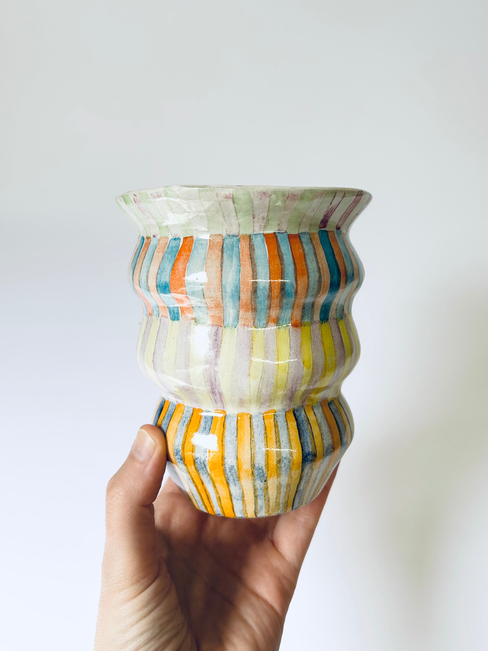 A colourful vase hand formed from buff stoneware clay, glazed with a shiny white glaze and painted with ceramic stains.